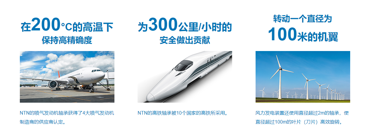 NTN的技術(shù)被眾多品牌制造商所信賴,除了在高溫(約200℃)、高速(約1萬圈/分鐘)條件下的噴氣式發(fā)動機,時速超過300千米的高速鐵路車輛外,在風力發(fā)電、火箭、汽車、醫(yī)療器械等領(lǐng)域也被廣泛應用。